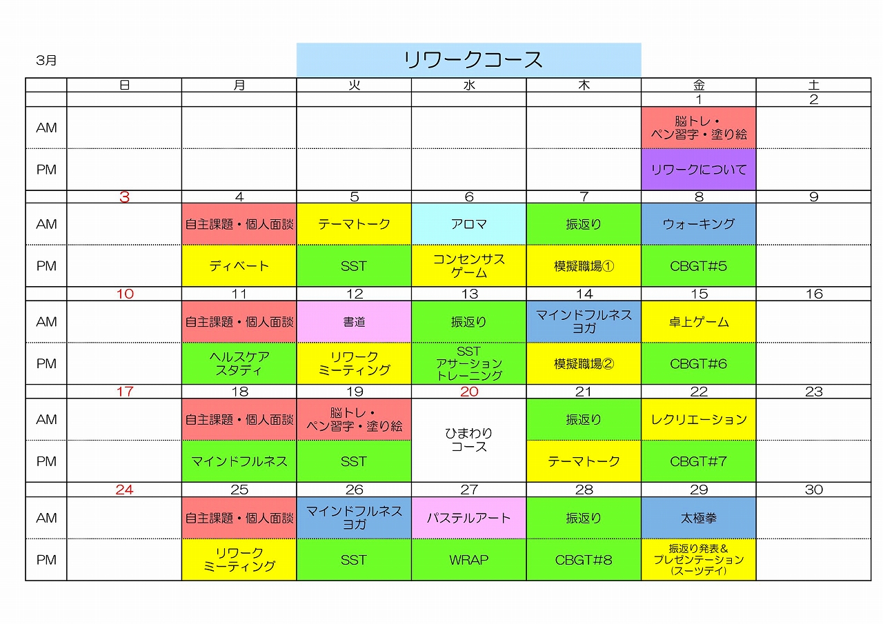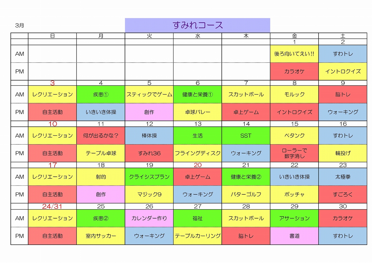 さて、2024年3月のデイケア各コース予定表が完成しましたのでお知らせします。