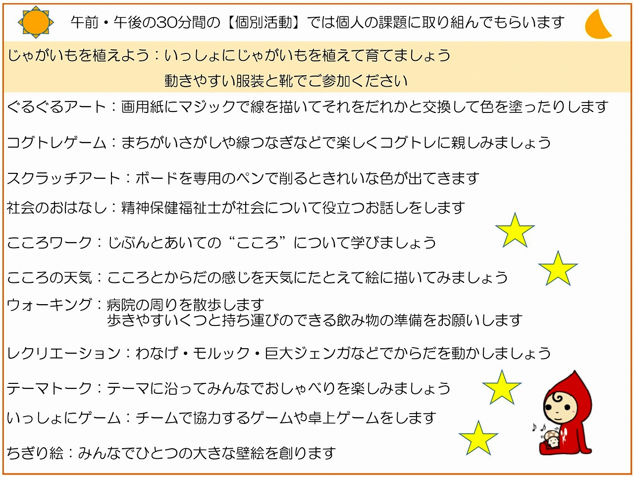 ※従来、日曜日のデイケアは30分繰り上げて実施していましたが