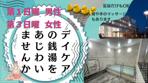 いい湯だな! デイケアでスーパー銭湯の気分を味わいませんか 😉 第1,3日曜日にデイケアの大浴場でお風呂が入れます。 4月7日(日)と21日(日) 持ち物はタオルと着替えをお持ち下さい。 « 前へ一覧へ 次へ »