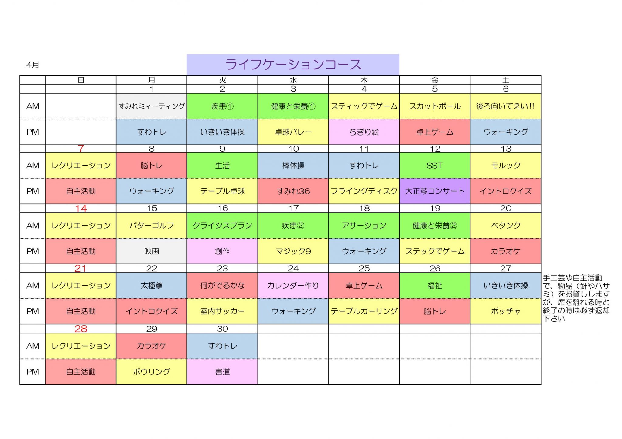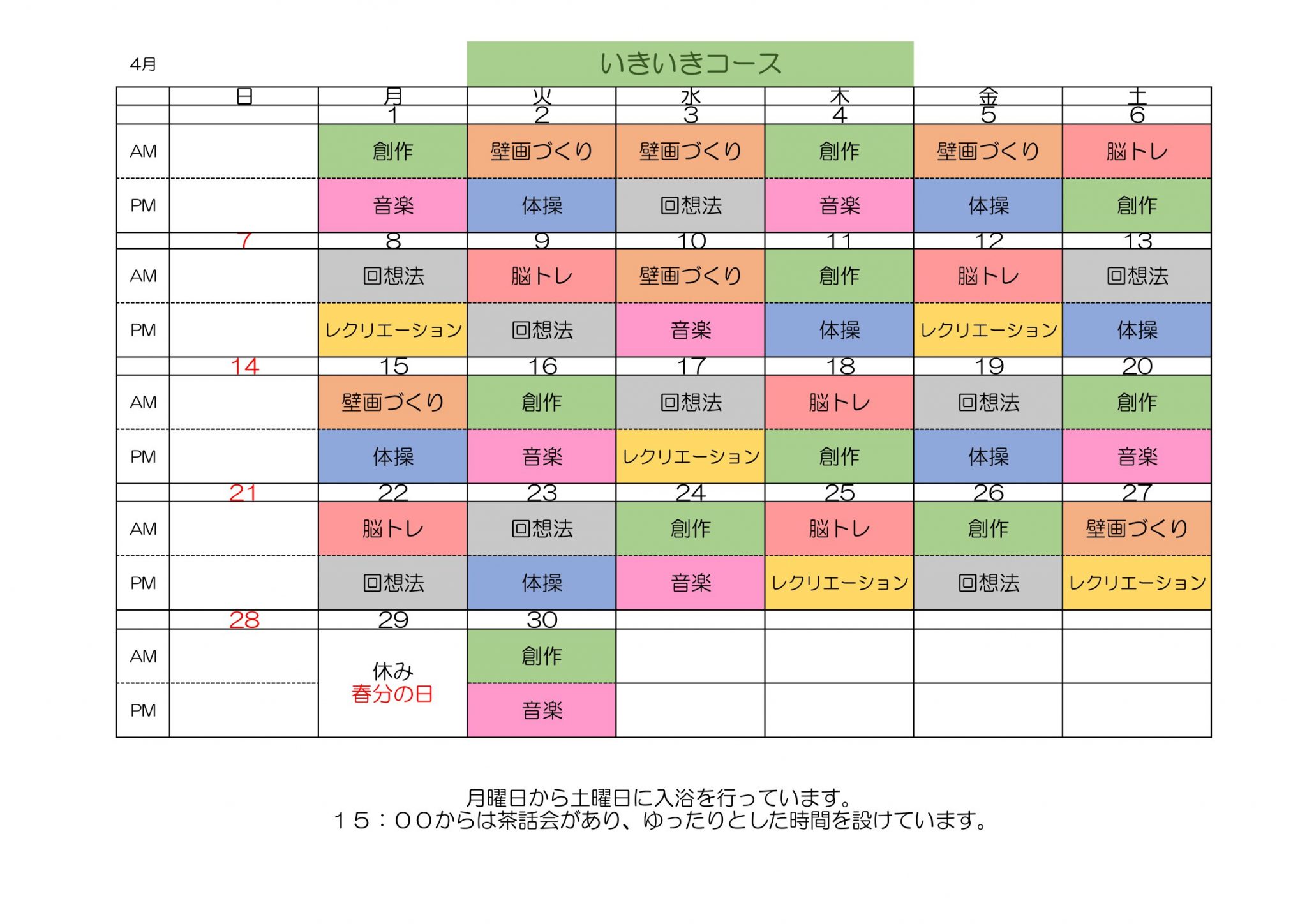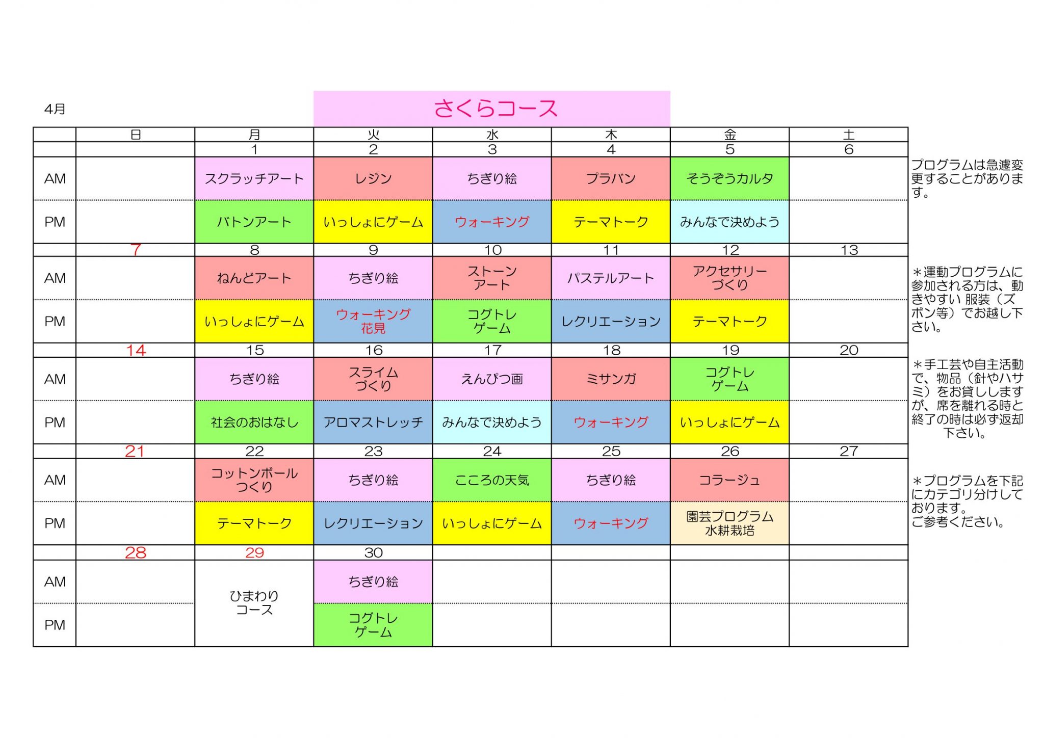 デイケア室 各コース 2024年4月予定表