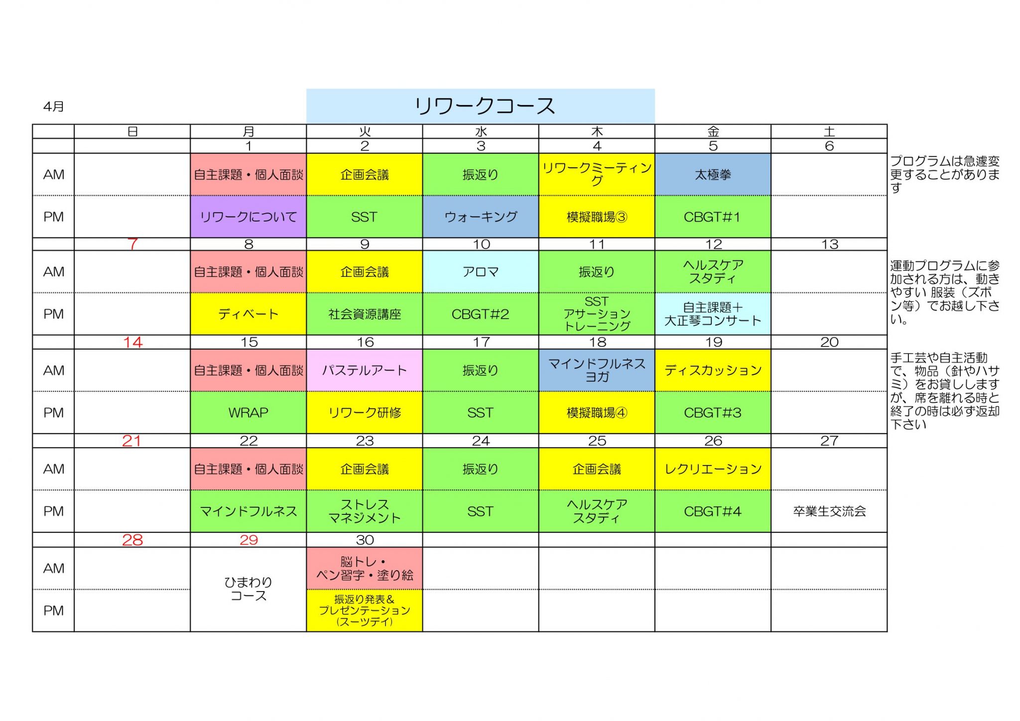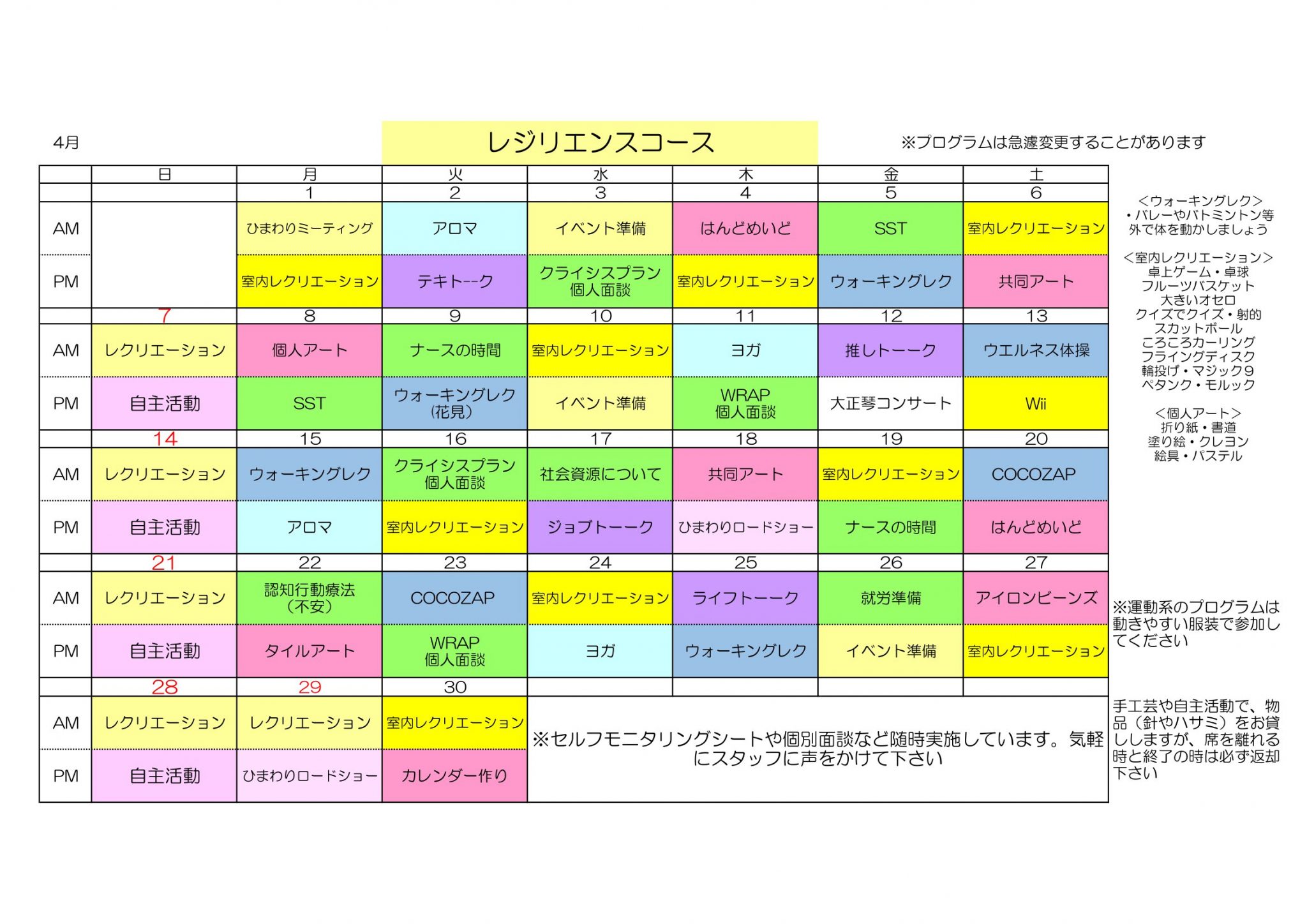 さて、2024年4月のデイケア各コース予定表が完成しましたのでお知らせします。