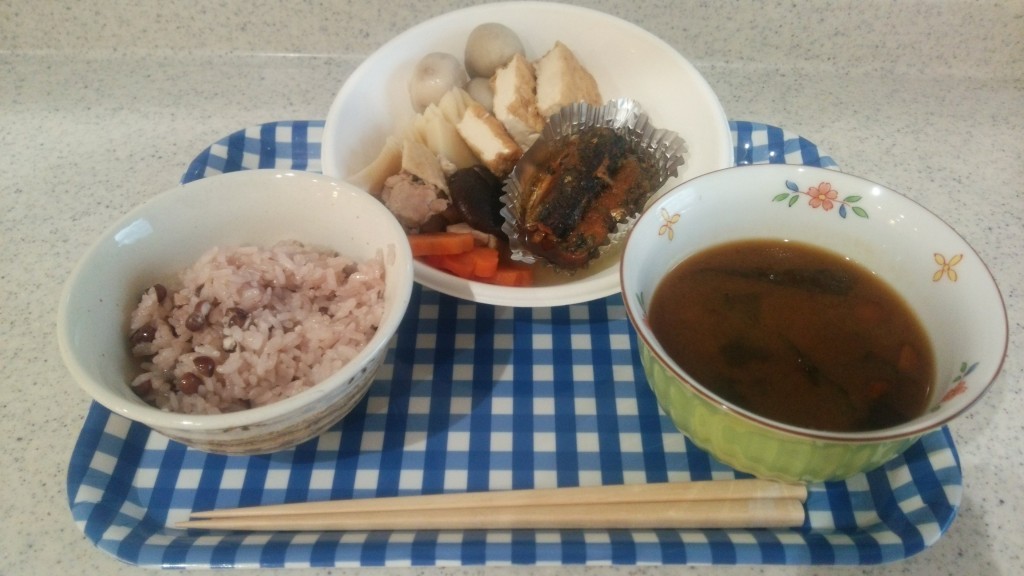 <晩ごはん:お赤飯・筑前煮・秋刀魚の佃煮・なめこ汁>