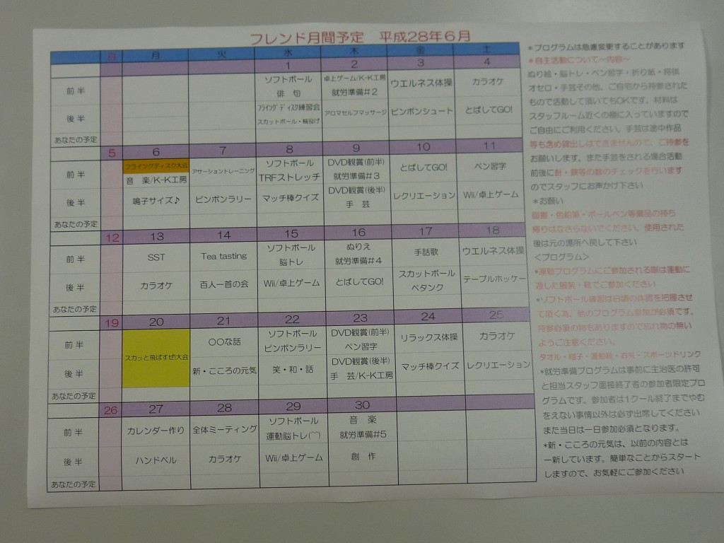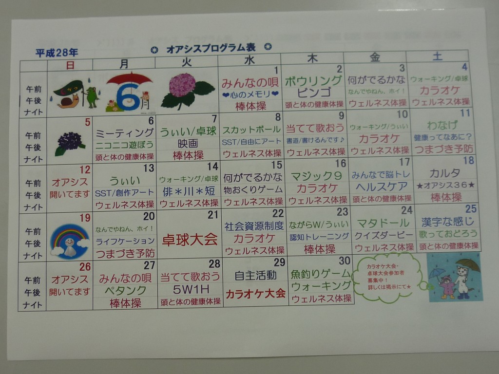 各デイケア、6月の予定 みなさん、こんにちは。 各デイケアの予定は、以下のようになっております。 デイケア(フレンド) デイナイトケア(オアシス) リワークデイケア ご参加お待ちしております!! « 前へ一覧へ 次へ »