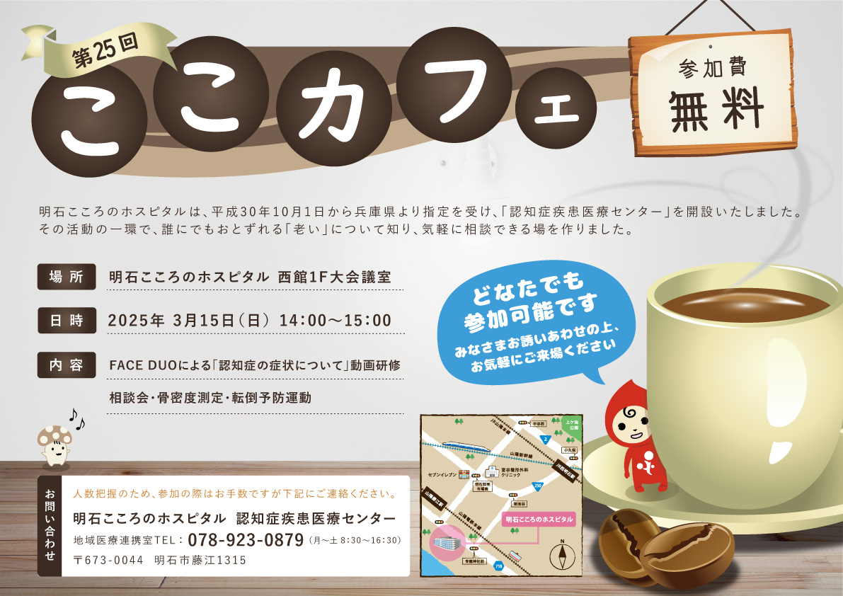第25回 ここカフェ開催のお知らせ 明石こころのホスピタルは、平成30年10月1日から兵庫県より指定を受け、「認知症疾患医療センター」を開設いたしました。 その活動の一環で、誰にでもおとずれる「老い」について知り、気軽に相談できる場を作りました。 « 前へ一覧へ